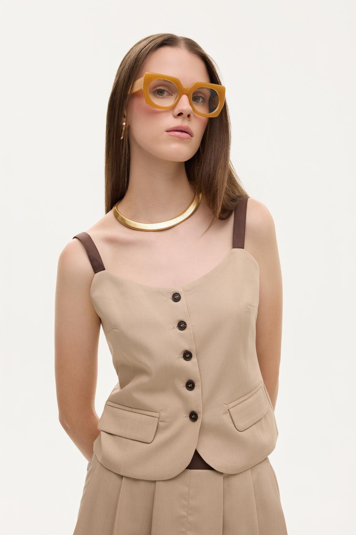 Quzu Kontrast Detaylı Bluz Bej