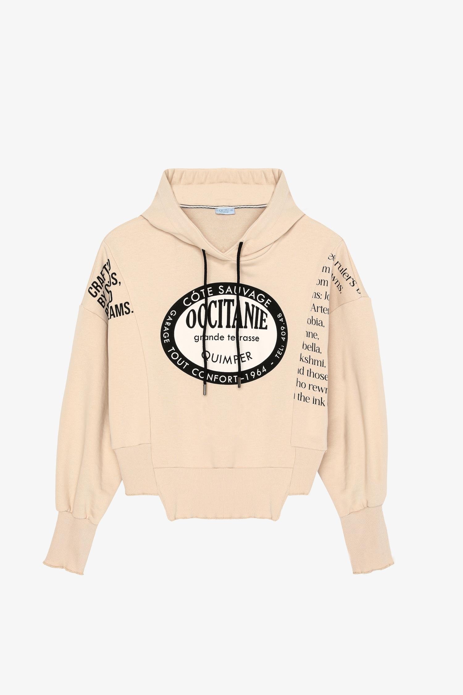 Quzu Önü Baskılı Kapüşonlu Sweatshirt Taş