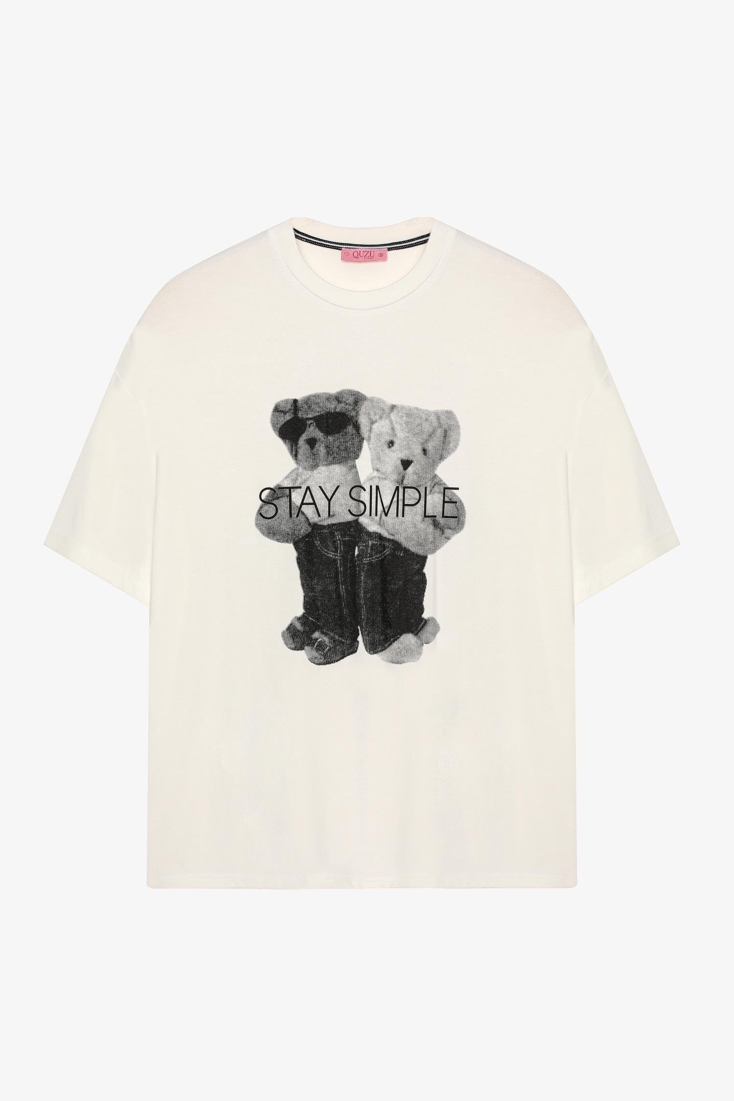 Quzu Önü Baskılı Oversize T-shirt Ekru